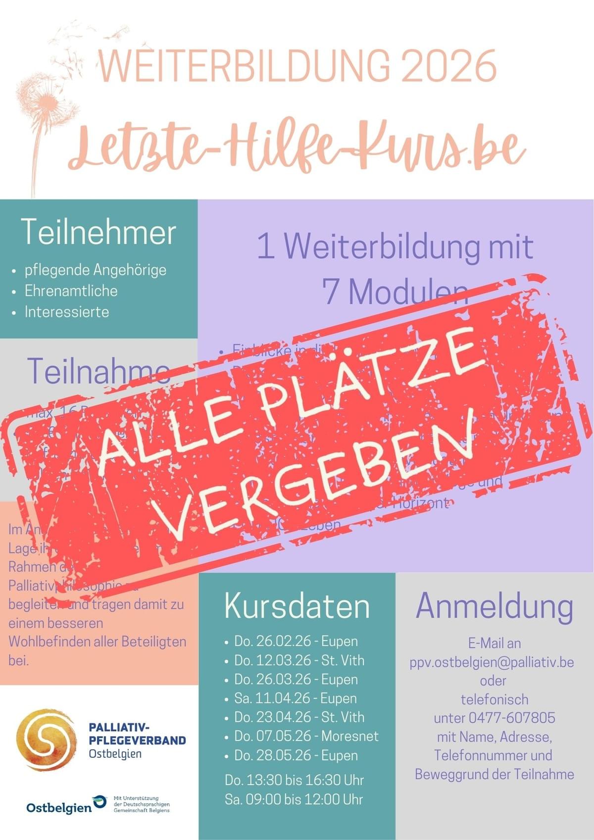 Im September 2025 hat der Palliativpflegeverband Ostbelgien den vierten LETZTE-HILFE-KURS erfolgreich durchgeführt. Die Teilnehmerinnen und Teilnehmer erhielten grundlegende Informationen zur Begleitung schwerkranker und sterbender Menschen. Inhalte des Kurses umfassten unter anderem Aspekte der Palliativversorgung, Möglichkeiten der Unterstützung im Alltag sowie den Umgang mit Abschied und Trauer.